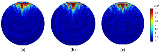 Sound pressure distribution of ST flow pattern: (a) oil fraction 20%; (b) oil fraction 40%; (c) oil fraction 60%.