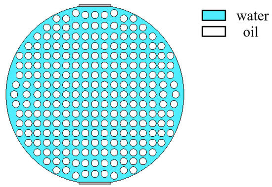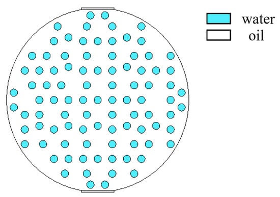 Angeli [9] studied the droplet size and concentration in bicontinuous dispersed flow and found that the farther away from the oil–water interface, the smaller the droplet size. The model of W/O&O/W flow is simulated in Figure 10. Typical simulation results of some W/O&O/W flow patterns are shown in Figure 11, where oil fractions are 40%, 50%, and 60%.