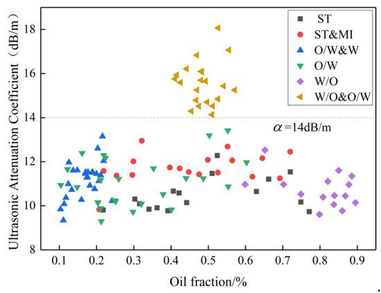 Based on the ultrasonic attenuation principle, the ultrasonic attenuation coefficients were extracted for each flow pattern analysis of oil–water two-phase flow. The ultrasonic attenuation coefficient of each flow pattern simulation result was calculated by Equation (1), as shown in Figure 16. The ultrasonic attenuation coefficient of W/O&O/W flow ranges from 14 to 19 dB/m in the oil fraction between 40% and 60%, whereas the ultrasonic attenuation coefficient of other flow patterns is in the range of 9 to 14 dB/m in the oil fraction between 10% and 90%. The results show that W/O&O/W flow pattern can be distinguished from the six flow patterns by the ultrasonic attenuation method.