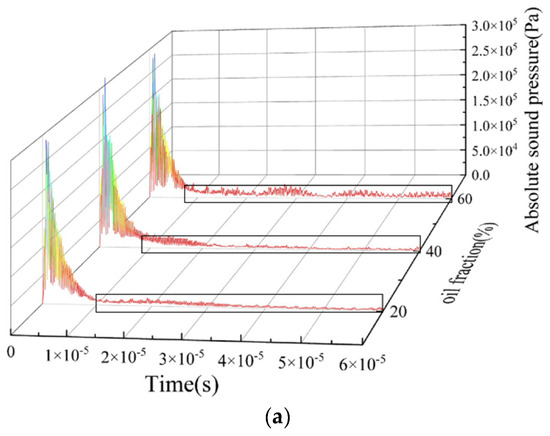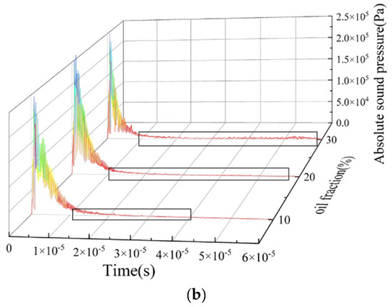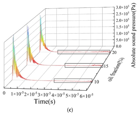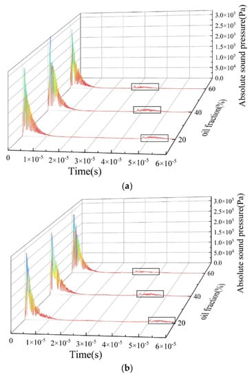 From Figure 17a,b, it can be seen that the echo duration is about 1 × 10−5 s, and the echo intensity is relatively high. Combined with the instantaneous sound pressure distribution at 3.4 × 10−5 s of the ST flow and ST&MI flow patterns shown in Figure 5 and Figure 7, reflected echoes are relatively focused, and most of the echoes’ energy is reflected vertically back to the transducer. This is mainly caused by the different acoustic impedance of the two fluids and the relatively smooth oil–water interface. From the reflected echo signals of oil fractions of 20%, 40%, and 60%, it was found that the transit time of the reflected echoes to the bottom receiver decreases with the increase in oil fraction.