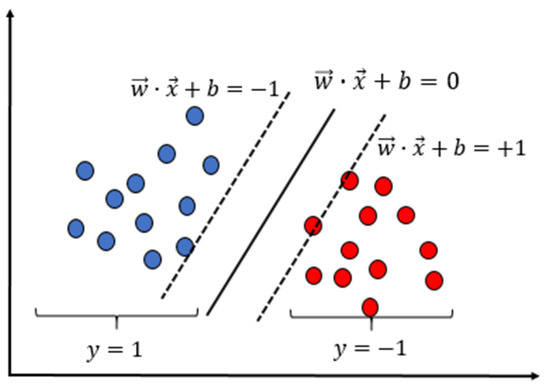 If , the sample becomes the support vector. If is greater or less than 1, the samples belong to the first category and the second category, respectively, as shown in Figure 20. The decision function of the SVM binary classifier is: