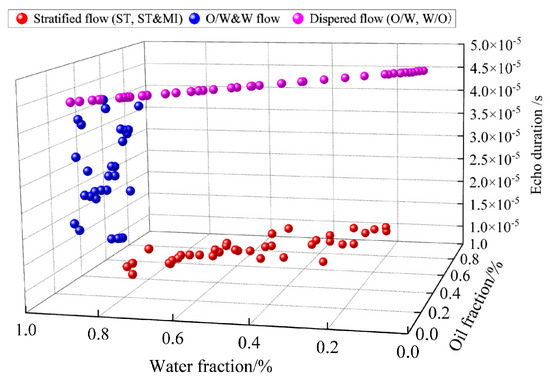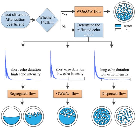 According to the characteristic analysis of the sound pressure signal above, W/O&O/W flow pattern can be identified firstly by the ultrasonic transmission attenuation method, and then stratified flow and dispersed flow patterns can be identified according to the ultrasonic reflection test method. The 132 groups of oil–water two-phase flow data in the simulation modeling were distinguished according to the flow pattern identification method shown in Figure 20. From Figure 16, the ultrasonic attenuation coefficients of the W/O&O/W flow pattern in different oil fraction ranges are all greater than 14 dB/m, whereas the ultrasonic attenuation coefficients of other flow patterns including stratified and dispersed patterns in different oil fraction ranges are less than 14 dB/m. The W/O&O/W flow pattern can be identified by the ultrasonic attenuation coefficient and the identification accuracy is 100%.
