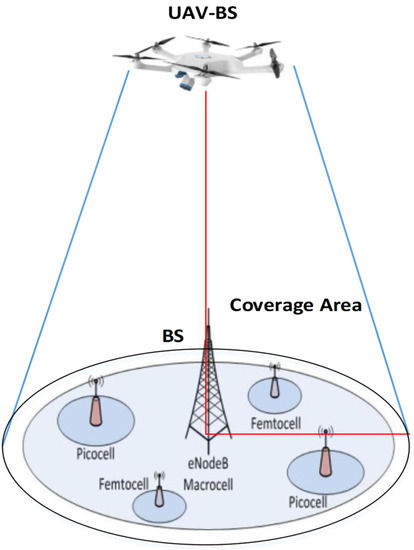 In cellular networks, the land areas are distributed into smaller areas called cells. These cellular network cells are joined together to increase the geographical area. Normally, each of these cells is served by a fixed location tower known as a Base Transceiver Station (BTS) or Base Station (BS) [5]. In these networks, the devices are connected with cellular towers (PECO cells/microcells), and smaller cells are connected with large cells, which are further connected with core networks [6]. The smaller cells are further connected directly to the core networks to acquire basic services for users. The cell size is different and considered by using the user’s density in the networks. These cells can be deployed in macro, micro, or pico levels [7,8]. A macrocell usually covers a wide area of radius, which is around 25 km depending upon the density of users. The micro cells normally have a coverage area of up to 2 km, whereas the pico cells are used to cover the smaller areas such as offices, shopping malls, and buildings [9]. The need for a smaller cell size is not only dependent on the coverage area but also affects user capacity. By dividing the cell into smaller levels, the reusability of the channel increases by many folds. The fixed BS provides best-effort connectivity services. However, the BS works in ideal situations such as proper tower foundation space, feasible installation, and obstacle-free areas. While they have many advantages, BS services also suffer from higher setup costs, maintenance issues, and other cumbersome processes. Moreover, where the deployment of physical infrastructure is difficult or there are more chances of natural disasters, such as floods and earthquakes [10], quick restoration and recovery of uninterrupted connectivity services are not possible. Some other issues also exist, such as power supply issues to the BS, generator cost, land issues, coverage, capacity, and road coverage concerns.