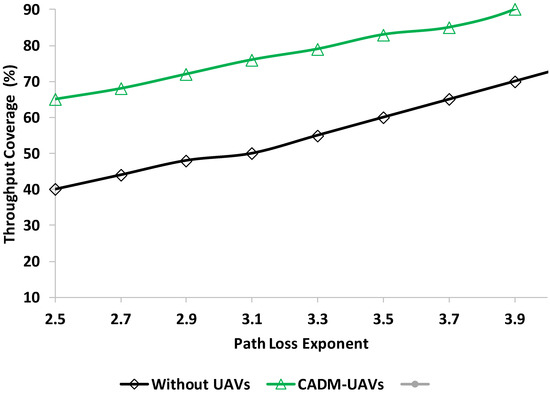 In throughput analysis, the throughput coverage percentage is defined. The coverage percentage of users is defined with a high SINR from the threshold, which is around 65%. As shown in Figure 5 the proposed model throughput coverage is better compared with non-UAV networks. The path loss exponent refers to the distance between the transmitter and the receiver and is measured in meters. Figure 6 shows the throughput analysis in the presence of users in a single macrocell.