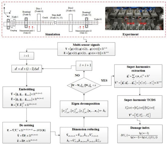In this work, the total-least-square method which has been used for noise reduction in the original DMD will be transplanted to the HODMD. Moreover, the order selection issue is tackled by designing an objective function to evaluate the identification accuracy of super-harmonic frequencies. After that, the super-harmonic components from all measurement points are extracted and reconstructed simultaneously, which are further examined to derive a damage index by general transmissibility and fractal dimension, and the derived damage index is investigated for crack localization for operating rotors. The details are in the following.