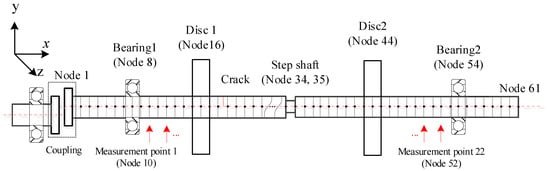 The numerical rotor model shown in Figure 2 is used to investigate the performance of the proposed method. In the model, the shaft is discretized equivalently by two-node twelve degrees of freedom (DOFs) Timoshenko beam elements, where each node contains three translational and three rotational DOFs. Each disc is considered a rigid body modelled by six DOFs lumped inertias at the corresponding node. The bearings are represented by isotropic spring-damping systems. A shaft with a reduced diameter is used to model the step shaft. Transverse cracks with breathing phenomenon are considered and modelled by linear fracture mechanics with strain energy release rate theory and the Crack Closure Line Position (CCLP) method [30]. In order to validate the performance of the proposed method to eliminate the interference of commonly existing super-harmonic components, sample parallel misalignment is considered by external excitation with two times rotating frequency [31]. Torsional and axial DOFs of the rotor in the driving end are fixed. Finally, the motion equation of the rotor system is established by assembling all element matrices as: