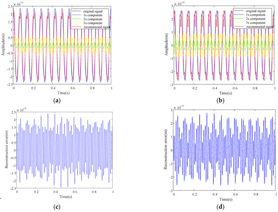 Figure 4 shows the extracted harmonic components for case one and case two at 840 r/min (which equals to the 1/3 critical speed of the rotor system) with d = 400. From the results one can see that the original signals are decomposed into single frequency components by HODMD, and the single frequency components can reconstruct the original signals accurately which makes the original and reconstructed curves almost overlap each other, and the reconstruction errors by the first three harmonics are shown in Figure 4c, d for case one and case two respectively. The magnitude of reconstruction errors is 10−9 m compared to 10−6 m of the original signal, which shows the accuracy of the decomposition by the proposed method, and the frequency components in the error diagrams are mainly higher frequencies, as only the first three order components are used for reconstruction. Moreover, the decomposition for all measurement points is simultaneously, which makes the HODMD well suit for the characteristic deflection shapes extraction.