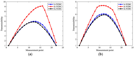 TCDS for the first three harmonics of numerical rotors: (a) case one; (b) case two.