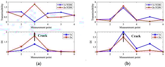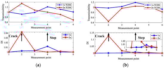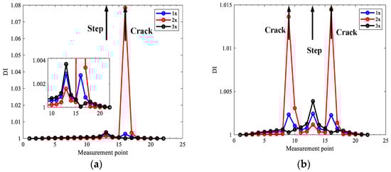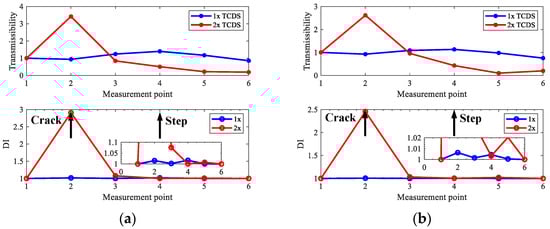 From Figure 5, one can see obvious distortions appear in the measurement points near cracks, especially for 2x TCDSs, in both case one and case two. However, this is not clear to localize cracks. However, the peaks clearly indicate the crack locations by the derived damage index in Figure 6. From Figure 6, one can see that the damage index from 2x TCDS can not only locate the cracks but also reduce the interference of steps which shows a small peak compared to the peak of the crack. While, the interference of steps on the damage index from 1x and 3x TCDSs cannot be omitted, which will mislead the crack localization.