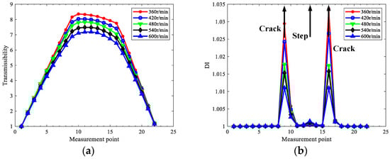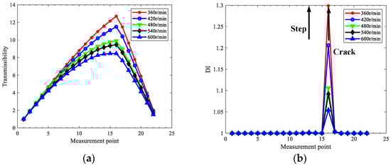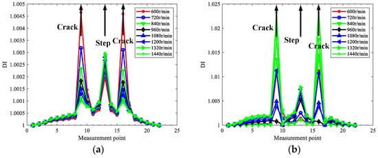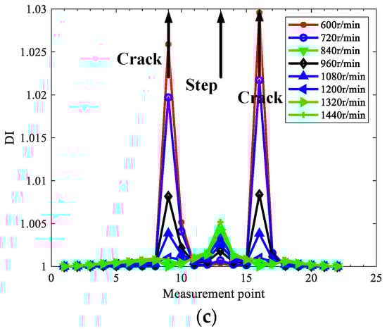 From Figure 7, one can see the rotating speed has a great influence on localization results, and the interference of steps can be eliminated by the proper selection of rotating speed. In detail, the higher the rotating speed, the more interference in the steps; hence, from the point of reducing step interference, low speed could be helpful for crack localization for stepped rotors. The interference of steps in 1x TCDS is always obvious and cannot be eliminated, regardless of the rotating speeds; however, 2x or 3x TCDS with relatively low speed can exclude the interference of steps.