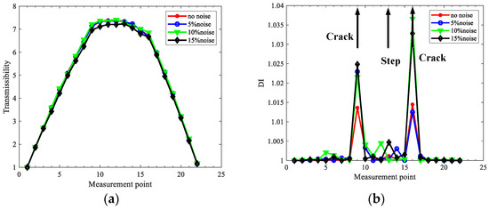 As shown in Figure 10, the peaks indicating cracks are obvious at the crack locations under noise levels from 0 to 15%, and interference from the steps can be neglected. The result indicates the good noise robustness of the proposed method. It should be noted that optimizing the order parameter d further would obtain better noise robustness of the proposed method, which will be discussed in Section 5.