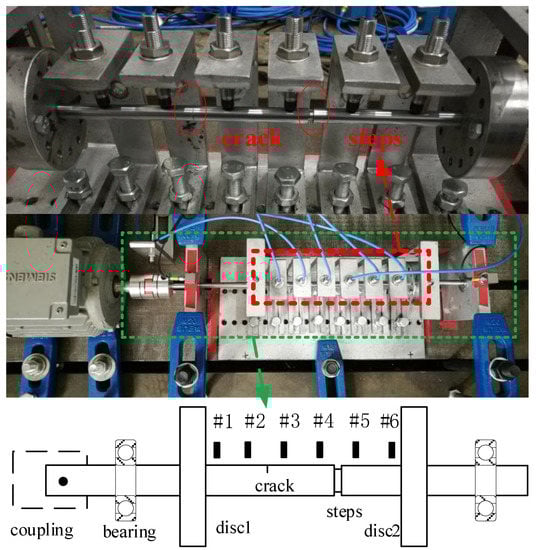 The proposed crack localization method will be validated by lab experiments in this section. The motor-driven two-disc rotor-bearing test rig is graphed in Figure 11. Cracks are manufactured by wire cutting, and the step shaft is simulated by a ring slot. Unbalance mass is added by a bolt in the disc, and residual misalignment is generated by no strict alignment of the rotor. Multiple-sensor responses are obtained by arranging six eddy current vertical displacement sensors along the shaft with a 5000 Hz sampling frequency. The rotating speeds are set as 600 r/min and 720 r/min to make the 2x frequency component away from critical speed. Detailed configuration parameters of the cracks and steps in the under-test rotors are provided in Table 2.