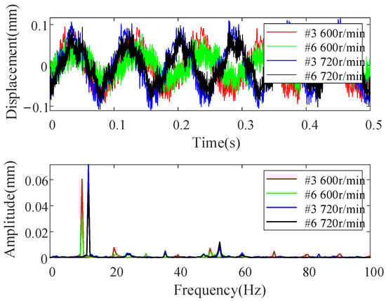 Typical measured responses in case three from measurement points #3 and #6 at rotating speed of 600 r/min and 720 r/min.