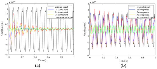 Extracted harmonic components based on HODMD when d = 1 for numerical rotors at 840 r/min: (a) case one; (b) case two.