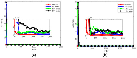 Then, how will the order parameter influence the decomposition results? In order to discuss this question, various values of d are explored, and Figure 17 shows the relationship between the value of d and the decomposition accuracy evaluated by the infinite norm between the extracted harmonic frequencies and theoretical ones with Equation (22) for cases one and two with various level of noise.