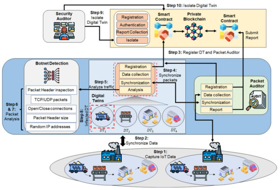 In the proposed framework, each DT and the PA is registered on the Blockchain network to ensure data collection is achieved from an authorized set of IoT devices. Each authorized DT validates itself to the decentralized network before transmitting data to the Deep Learning model for botnet detection. Each data point transmitted is further verified by synchronizing the packet data collected by both DT and the PA, reducing the risk of man-in-the-middle attacks and ensuring data security and Integrity. The collection of packet data by the Deep Learning model includes only Packet Headers enabling analysis of encrypted data without requiring them to be decrypted. Deep Packet Inspection of encrypted packets is not required, ensuring Data Privacy is maintained. The detection of an infected DT is prevented from inter-digital communication by revocation of the certificate. Devices that are part of an infected digital twin are blocked from transmitting data to other machines to prevent the spread of the botnet script and ensure the availability of non-compromised IoT devices. Lastly, recording IP addresses in the Blockchain network allows the network to accurately establish and label all infected devices that are part of a DT as compromised and requires a firmware update procedure to remove the botnet script and close software security vulnerabilities.