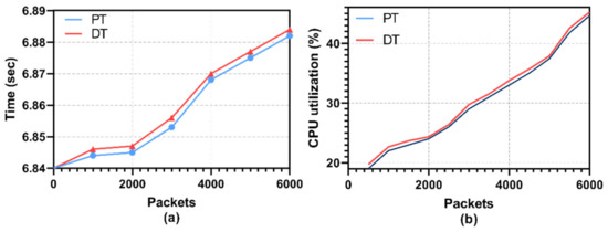 We compared the performance of the PA with a baseline model using real-time packet analysis between the PA and the DT. The detection time between the baseline model and the proposed framework are nearly identical, where the real-time model outperforms packet analysis by 0.003 s. Table 5 outlines the performance of all eight , where the lowest difference recorded is 0.002 s, and the highest time difference is 0.005 s. We attribute the higher performance of the baseline model due to the active detection of variation in packets. In Figure 5b, we observe a high consumption of CPU resources in the baseline model, where the average difference is 6.73% between the models. The proposed framework outperforms the baseline model due to the lower and upper boundary limits that define when the PA packet analysis process is initialized.