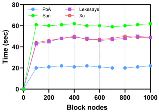 As illustrated in Figure 7, we observe the attack resistance of the PoA consensus model in comparison with related studies. We observe the PoA has a steady transaction speed despite the growing number of block nodes being compromised due to the blocks being pre-validated. The generation and approval of blocks are granted to only a single validator, the security vendor. In the event that the number of compromised nodes grows, the validator excludes them from the list of approved blocks allowing the network to process transactions at a steady average rate of 21 transactions per second. Other proposed models. such as those proposed by Xu et al. [29], Sun et al. [28], and Lekssays et al. [27], have high resistance to DDoS attacks; however, they are compromised when the count of nodes exceeds the count of valid nodes.