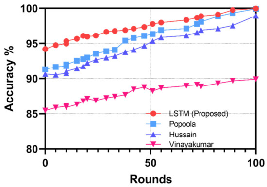 Figure 8 illustrates the performance comparison of the LSTM compared with existing studies. The LSTM model performs more accurately, which is attributed to the feature-selection process focusing on the mean packet arrival rate and the half-open connections. The accuracy of the LSTM is measured the highest at 99.97% after the completion of the 100th round of training. The CNN model presented by Vinayakumar et al. [25] performed the lowest in terms of accuracy, demonstrating the performance impact of converting features into a visualized format for anomaly detection. Popoola et al. [22] proposed a Federated Learning model approach, and, for comparison, we measured the final global model’s performance. Each model used a different dataset, highlighting the impact of feature selection on the model’s performance. Table 6 presents the Precision, Recall, and F1 score comparison for quantitative analysis with existing studies.