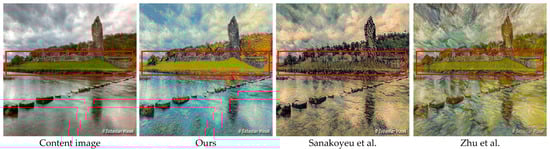 Comparison with Sanakoyeu et al. [] and Zhu et al. [] from Van Gogh’s style. These methods implement style transfer based on a collection of style images. The red frame shows that the effectiveness of jointly training IFFM content loss and style loss, and our method can achieve style transfer based on semantic information.