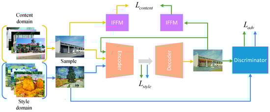 Recently, there are several methods [,,] based on generative adversarial networks [] that can achieve the style transfer of a class of style collection. The generative adversarial network is composed of two parts: generator and discriminator. The main thought is mixing the spurious with the genuine to achieve a dynamic balance. Zhu et al. [] introduced the cycle consistency loss to transfer the image from the source domain to the target domain, but the result generated by this method will produce rough texture because the loss function measures the difference between the generated image and the content image in the RGB space. In order to solve the above problems, Sanakoyeu et al. [] proposed a style-aware content loss function to optimize the content features in the stylized results, but the stylized images may inevitably produce deformations and texture distortions. Ma et al. [] proposed that [] did not consider semantic information and regarded the content domain and style domain as two separable parts, so they proposed dual consistency loss to achieve semantic-related style transfer. However, the limitation lies in the need to manually select content images related to the theme of the style image. Recent contrastive learning models [,,] show that the non-linear projection head can filter out the invalid features. Therefore, this article refers to the idea of introducing an invalid feature filtering module into the encoder–decoder structure, which extracts the structural features of the content after the input image and the generated image are filtered to avoid the interference of redundant texture features.