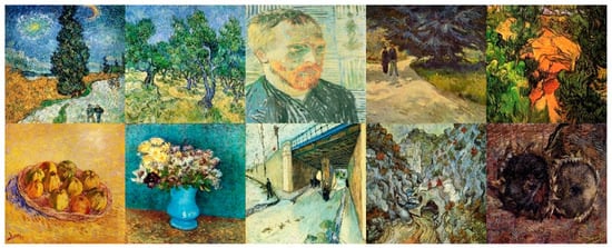 We use Places365 [] as the dataset of content images in order to better adapt to the style transfer of more scenes. This dataset contains 365 scene classes in life, covering a wide range and comprehensiveness, including 1.8 million training images. We randomly sampled 768 × 768 image patches from the dataset as content images for training. There is no need to manually choose the paired images related to the structure theme as in []. We adopt the collection of style images selected by automatic grouping in [] from Wikiart []. An example of the style image collection after style grouping is shown in Figure 4 (part of the Van Gogh style image collection example).
