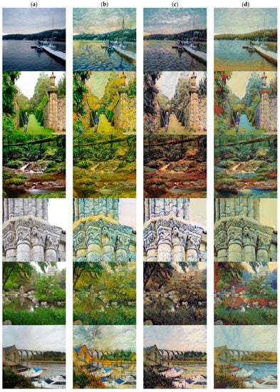 Figure 9 shows the comparison between our method and the researches based on single style transfer. In theory, the effect of using a convolutional neural network to achieve style transfer proposed by Gatys et al. [] is the best. However, as shown in Figure 9, the methods [,] implement style transfer between a single content image and a single style image, which may cause uneven color distribution. On the contrary, our stylized images can represent a type of painting from a certain painter. Therefore, our stylized results naturally contain the information of multiple style images, and the colors of the styles corresponding to different content in our generated images are also different, which greatly reduces the uneven color distribution. Although the studies [,] mentioned that the transfer based on the style image collection can be realized by calculating the Gram matrix of different style images, it also shows that the effect of the style transfer based on the calculation of the Gram average is not good. Our method can not only preserve the visually reasonable results, but also meet the real-time style transfer.