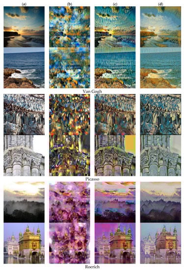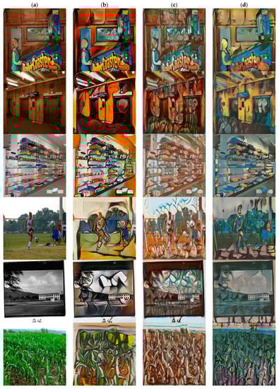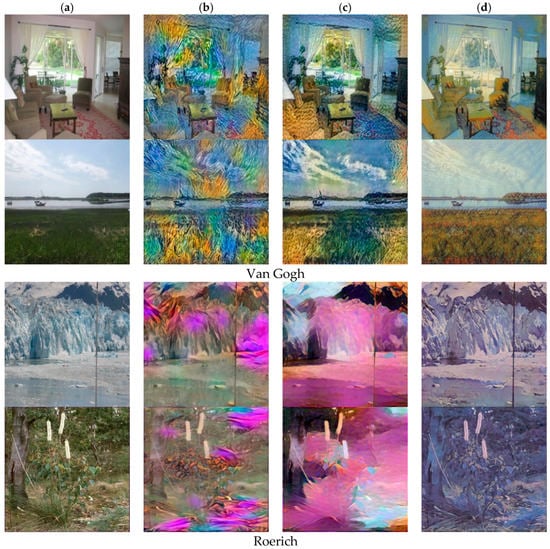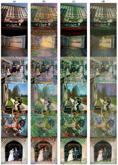 - Gatys, L.A.; Ecker, A.S.; Bethge, M. Image style transfer using convolutional neural networks. In Proceedings of the 2016 IEEE Conference on Computer Vision and Pattern Recognition (CVPR), Las Vegas, NV, USA, 27–30 June 2016; IEEE: Piscataway, NJ, USA, 2016; pp. 2414–2423. [Google Scholar]