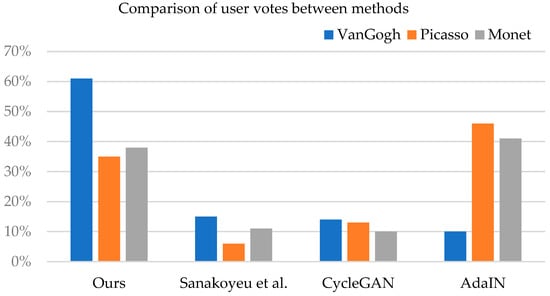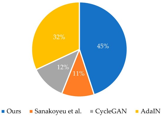 There is currently no more authoritative unified quantitative evaluation standard to judge the performance of style transfer tasks. Moreover, the goal of style transfer is to meet the needs of users, so the subjective feelings of users are crucial to the evaluation of stylized results. Therefore, we evaluate different methods through user voting. We compare our method with three researches [,,]. For each method, we choose three styles, and randomly select 5 style transfer images for each style. Given the original content image and the corresponding style, users choose their favorite image from the images in each style. Figure 11 shows the result of collecting 1230 votes from 82 users and converting them into an average percentage. It is obvious that our method is more popular.