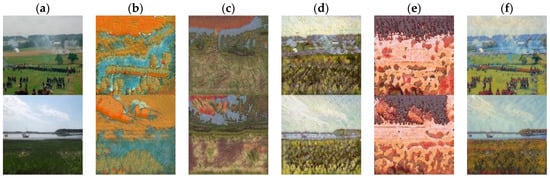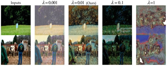 We also analyze the influence of the weight parameter in Equation (4) on the experimental results. The weight parameter mainly controls the importance of adversarial loss, and adversarial loss mainly optimizes style characteristics, so the style characteristics become more and more obvious with the increase in in Figure 14. In order to better balance content features and style features, we set to 0.01 in a comprehensive consideration.