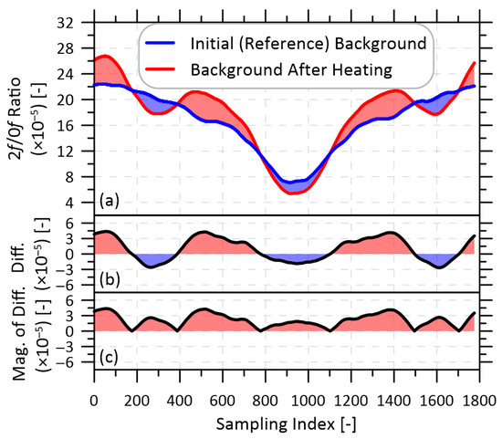 Illustration of a change in background signal of a device under thermal test. (a) The 2f/0f background signals before (reference) and after the device was heated; (b) The difference between the backgrounds; and (c) the magnitude of this difference. In this example, the integrated magnitude of the background difference across the scan is = 0.0377 [-].