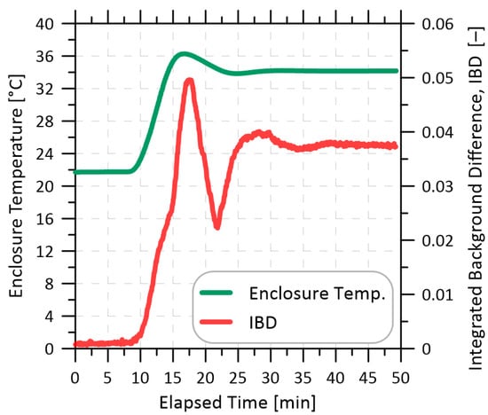 Typical progression of measured enclosure temperature and integrated background difference ().