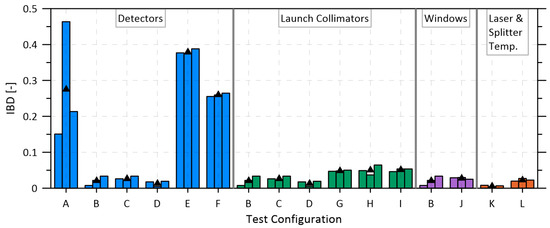 As summarized in Table 1 and Table 2, initial experiments investigated the four main components in the optical measurement path: the laser splitter (and associated connectors), launch collimator, optical windows, and photodiode detector. A summary of the test configurations is provided in Table 1 and details of the individual tested components are shown in Table 2. Comparison results, evaluated in terms of the , are plotted in Figure 4.