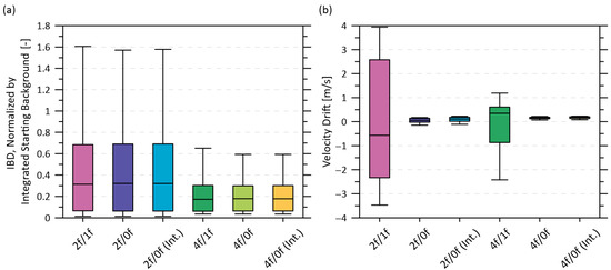 Figure 5a shows box and whisker plots of for each WMS harmonic, as measured during the combined experiments A–F presented in Section 3.1 using the six different detectors of Table 2. The lock-in amplifier was programmed to log four concurrent harmonics for each test: 0f, 1f, 2f, and 4f. To permit comparison given the differences in magnitude among the harmonics at the same methane absorbance, the is normalized by the integrated background () for each harmonic prior to the start of the heating cycle. From these tests, it appears that all 4f harmonic combinations experience roughly a factor of two less background change than the 2f harmonics during the heating tests. However, changes in the background signal level alone do not determine the final amount of measurement drift, particularly for velocity. The different magnitudes of the harmonics affect relative signal to noise ratios and, in particular, the different shapes of the harmonics yield different sensitivities to background noise when the up- and downstream laser signals (each with independent background optical noise characteristics) are cross-correlated to measure velocity.