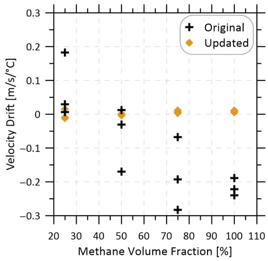 Measured velocity drift at different methane volume fractions during controlled heating of the original and updated flow cells.