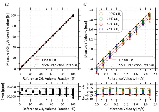 (a) Calibrated methane volume fraction and (b) bulk velocity measurements at four methane volume fractions of the updated sensor, including overall prediction intervals at 95% confidence. Corresponding measurement error is shown in the respective lower plots.