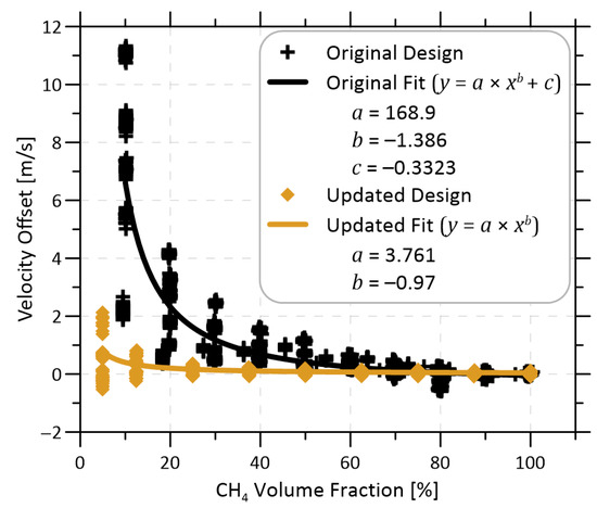 As previously mentioned, the original methane mass flow sensor required an empirical velocity offset correction that was dependent on methane volume fraction. This velocity offset placed a significant limitation on the applicability of the sensor, restricting its usefulness to specific scenarios where the methane volume fraction was not expected to vary. Importantly, no such correction was applied to the data for the updated sensor shown in Figure 8. To investigate this further, Figure 9 reproduces the original velocity offset data and derived correction function from Festa-Bianchet et al. [17], and overlays equivalent test data for the updated flow cell from the present work. While in both cases, the apparent velocity offset became undefined towards zero methane fraction as there is no longer a methane signal to detect, the present data demonstrate that the offset is negligible at methane fractions ≥ 25%. This is a significant improvement over the previous design.