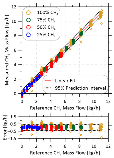 Finally, Figure 10 plots measured methane mass flows using the updated system versus prescribed flow rates from the mass flow controllers. The different colors identify measurements made at different methane volume fractions between 25–100%. The lower plot shows the error in the measured flow rate and for both plots the dotted lines show prediction intervals at 95% confidence. Over the full range of data in Figure 10, the updated methane sensor achieved a mass flow rate uncertainty of ±0.40 kg/h at 95% confidence. This is more than a factor of six improvement over the previous sensor that reported a ±2.55 kg/h uncertainty under identical conditions, and more than a factor of two improvement over the previous best case ±0.85 kg/h uncertainty for scenarios where the methane volume fraction was stable.