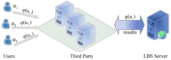 This architecture consists of users, a third party, and an LBS server. One or more servers represent a third party [49,50], and these are the servers that generate the dummy location set for the query user in order to mask the true location. Figure 3 depicts a third-party architecture. The primary responsibility of the third party is to collect and process user query requests, protect sensitive location information using privacy protection techniques, and then forward the processed query requests to the LBS server. After receiving these requests from the third party, the LBS server retrieves the database and transmits the matching result sets to the third-party servers. Finally, the requesting users receive the result sets from the third-party servers. Third-party servers, for example, create a cloaking zone with multiple users, and all users in the zone submit the same query to LBS. In this case, the LBS server is unable to determine who initiated the query and, as a result, is unable to find out which location is the original requesting location.