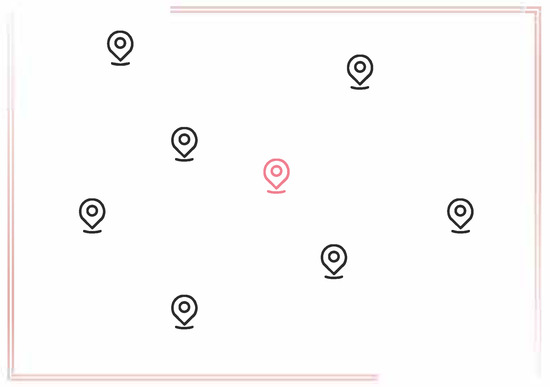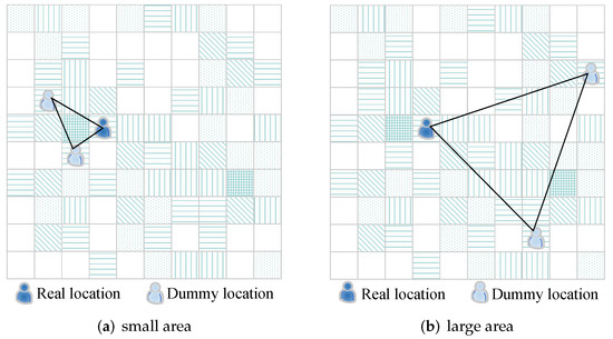 If the physical dispersion between locations is too small, the cloaking area will be too small. The cloaking area, as shown in Figure 7a, is small, allowing the attacker to quickly deduce that the real user is in a very small area. As a result, something like Figure 7b would be preferable because it provides a larger cloaking area for the real user. Simultaneously, the query probability of those chosen dummy locations is not too far off from the user’s actual location. As a result, when selecting dummy locations, the spatial distribution of the dummy locations and the real ones should be guaranteed, while the historical query probability should be the same or similar.