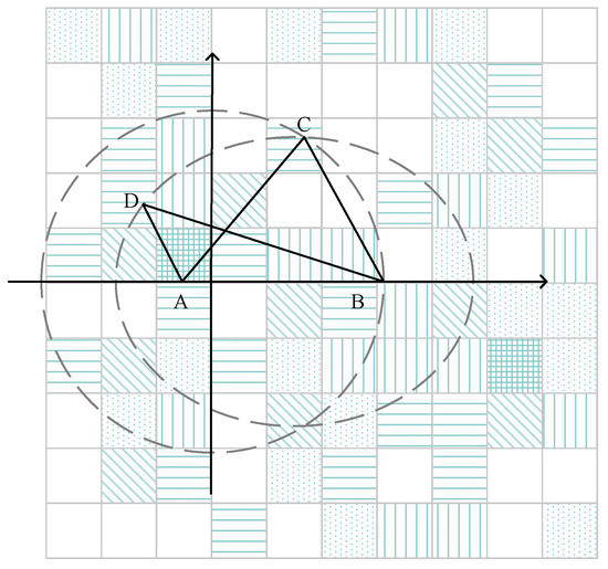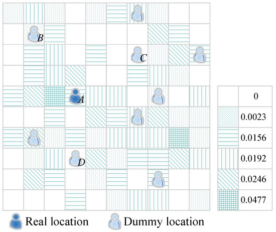If the server filters out m dummy locations, the likelihood of identifying the user’s dummy location increases from to . In the entire map space, Figure 6 depicts the distribution of all locations and their historical query probability. Each little grid cell in the diagram represents a location. Varied shadow shapes portray different historical query probabilities, and the sum of the probabilities of all locations initiating query requests in the entire grid space is 1. Location A represents the user’s real location, whereas B, C, and D are the dummy locations that have been chosen. Because their historical query probability is smaller than the real location’s or even zero, the server can easily filter these dummy locations out.