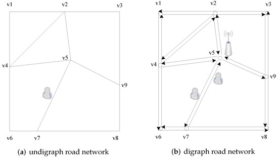It is apparent from the effective distance calculation formula that the essence of the effective distance specified by them is the Euclidean distance. Despite the fact that the article is based on a real-world road network, Euclidean distance is nevertheless employed to measure location distribution features. Chen et al. [62] proposed a privacy protection method for the road network in response to the fact that the distance between any two points in real life is not a simple linear distance (Euclidean distance), and that users’ activities are more restricted to the planned road. This approach requires that the number of road sections in the selected dummy sites satisfy the value given by the user in order to attain the purpose of physical dispersion between the selected dummy locations when picking dummy locations. This road network, however, is an undigraph road network model, which is insufficiently realistic for real-world road network simulation, as illustrated in Figure 9a. Zhou Changli et al. proposed a location privacy protection approach based on the digraph road network architecture (as shown in Figure 9b), in which an anchor point (dummy location) was used to replace users’ real locations when initiating query requests. However, when choosing the anchor point, the historical query probability of the anchor and its geographical spatial distribution link with a real user were not taken into account.