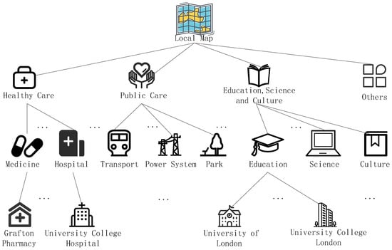 This then transforms the results to show semantic similarity [65]. Using Euclidean distance and the relationship between sets to quantify semantic difference not only consumes a lot of effort but also weakens the algorithm’s efficiency. Another author [9] created a location semantic tree (LST) to arrange all locations, as shown in Figure 10, in order to achieve semantic similarity control that can serve the tailored needs of users and increase the efficiency of algorithm execution. The most fundamental semantic information is stored in the leaf nodes of the location semantic tree, and the hop number between the leaf nodes is used to calculate the semantic distance, which is then used to calculate the semantic difference degree. This approach can rapidly find and categorize the semantic associations of all locations in a specified geographical area.