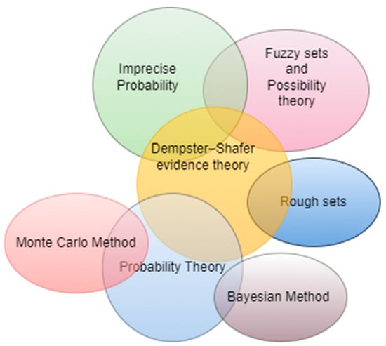 Several challenges are linked to uncertainty management. These issues particularly include its representation, identification, combination, and propagation. To represent uncertainty different models could be used. Probabilistic distribution has been used to deal with uncertainty problems. However, this will be costly in the case of continuous variables and hard to compute in cases of conditional distributions. Probabilistic graphical models have also been used to solve uncertainty [11]. Graphical models provide a powerful and flexible way to model relationships between variables and have been applied with great success [12]. Graphical models have also been suggested to model beliefs. An overview of the most common belief graphical models is presented in [11]. Automated uncertainty handling could be allowed via the qualification of uncertainty using probabilistic, fuzzy approaches, or rough sets [13]. Fuzzy sets are based on calibrating concepts and linguistic ambiguities. Probabilistic models use different probability distribution functions and statistics for modeling and could be used in aleatory and epistemic uncertainty [9]. Rough sets are mathematical tools to handle uncertainty and incomplete information. Sharing context information could also be used to jointly mitigate uncertainties [8]. Dempster–Shafer theory (DST) is widely applied to uncertainty modelling and knowledge reasoning because of its advantages in dealing with uncertain information [14]. These uncertainty models have a greater expressive power than probabilistic ones; however, they are more complex and often have higher computational cost [15]. DST (Evidence Theory or Belief Function) is effective in uncertain information modeling and processing, and it has been widely used in many fields. Figure 1 shows the relationship between main uncertainty theories. Probability theory and fuzzy theory are the most common theories to model uncertainty [9]. Probability theory can deal with both aleatory and epistemic uncertainty and is the most widely used method in almost every field. The review in [9] examines further existing uncertainty theories. A variety of approaches have been developed based on the classical Probability theory such as Monte Carlo method, Bayesian method, Subjective Logic, and extended models of DST. The DST belief model is highly expressive and extends the notion of probability while Monte Carlo is considered not suitable for projecting epistemic uncertainty through a complex model [16]. The Bayesian approach incorporates the uncertainty by model averaging. Bayesian model averaging (BMA) addresses the problem of model selection not by selecting a final model, but rather by averaging over a space of possible models that could have generated the data [17]. The Transferable Belief Model (BTM) concerns the same problem as the one considered by the Bayes model, except it does not rely on probabilistic quantification but on belief functions. Subjective Logic is an uncertain probabilistic logic that was initially introduced by Audun Josang to address formal representations of trust. In Subjective Logic (SL), the subjective opinion model extends the traditional belief function model of belief theory in the sense that opinions take base rates into account, whereas belief functions ignore base rates. SL could be used for probabilistic reasoning under uncertainty and model both probability and uncertainty. There are different models of uncertainty resulting from applications of probability theory such as Bayesian Belief Networks, Markov Decision Process Graph, Goal function roadmaps, etc. The Bayesian Belief network helps to model conditional dependencies using a directed acyclic graph. Bayesian Networks (BNs) have gained popularity in environmental risk assessment because they can combine variables from different models and integrate data and expert judgment and they are able to model conditional probabilities. Aleatory BNs are the most relevant for environmental risk assessment, but they are not sufficient to treat epistemic uncertainty alone because they do not explicitly express the parameter uncertainty [18]. In [18], the authors recommend embedding an aleatory BN into a model with parameter uncertainty for risk assessment. In addition to evidence theory, entropy has been used as a typical method for uncertainty measure and management [19,20,21,22]. In evidence theory, the belief entropy or uncertainty measure of mass function or basic probability assignment (BPA) is used to address the information volume of evidence [19]. A variety of entropies exist, such as Shannon entropy and Deng entropy, which is a generalization of Shannon entropy in the Dempster–Shafer framework [22]. The Belief Function Theory has shown its ability to model uncertain knowledge. It allows knowledge combination obtained through various sources of information. However, some requirements, such as exclusiveness hypothesis and completeness constraints, limit the development and application of DST theory to a large extend [14]. To overcome the shortcomings and enhance its capability of representing the uncertainty, a new mathematical tool to represent unreliable information, named D numbers, was proposed by Deng in 2012, which mirrors the framework of D-S theory. Compared with the classical DST, D numbers abandon the exclusiveness hypothesis of the frame of discernment (FOD) and mass function’s completeness constraint in DST, which make D numbers more reasonable and capable of modeling the ambiguous, imprecise, and vague information [14]. The D numbers, as a reliable and effective expression of uncertain information and has a good performance to handle uncertainties such as imprecision and incompleteness [23]. Other theories have also been proposed in literature as extension of on existing uncertainty theories [20,21,22].