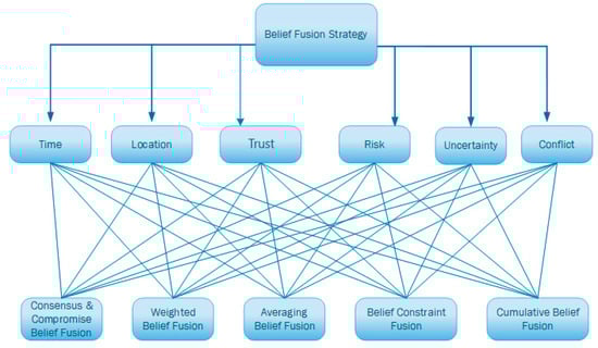 The decision-making process is a core component in modern IoT applications. A variety of machine learning algorithms and framework can be used to derive decisions and improve a variety of operational aspects, such as planning [46], scheduling [47], resource allocation [48], etc. Multi-criteria decision making (MCDM) is one of the most well-known branches of decision making. MCDM is divided into multi-objective decision making (MODM) and multi-attribute decision making (MADM). However, very often the terms MADM and MCDM are used to mean the same class of models [49]. MODM studies decision problems in which the decision space is continuous. MCDM/MADM concentrates on problems with discrete decision spaces. In these problems the set of decision alternatives has been predetermined. The weighted sum model (WSM), the analytic hierarchy process (AHP), the revised AHP, and the weighted product model (WPM) are examples of MCDM. One of the most important aspects of the AHP method is the organization of the problem in a systematic way, such as by goal, criteria, and alternatives, that provides a structured simple solution to decision making problems [50]. In AHP, it is important to take into consideration uncertainty in multicriteria decision making. At the same time, DST has received the considerable attention of different researchers whom explored its potential in various domains. In 2000 Beynon et al. develop a methodology in the field of decision making that incorporates DST with the AHP to solve complex problems involving multiple criteria. In [51], the authors propose to improve classical multi-criteria decision making by integrating uncertainty theories such as fuzzy sets, possibility, and belief function theories using a three-fusion process. In this work the proposed approach has been applied to natural disaster taking in consideration variant criteria like the sensitivity of the avalanche prone area. A variety of MCDM models have been combined with uncertainty theories. In [52], the authors suggested to develop an Elimination and Choice Translating Reality (ELECTRE)-based MCDM method where the evaluation of information is expressed and handled by a DST. In [26], the authors propose an MCDM method based on D Numbers and belief entropy. AHP, essentially, is the process of assigning different weights to different options and summing them up. In this work, we calculate the weights based on meta-data of received and perceived information and the quantification of subjective beliefs.