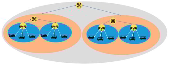 To show the utility of the proposed belief management module, we here present an example of the application in ITSs where the environment contains vehicles, road infrastructure, roadside units, drones, etc. For simplicity, the environment will be divided in a grid-based decomposition. Each drone is assigned to a region as presented in Figure 5. In each of the region one or many roadside units will be placed. The vehicles will report traffic events to the roadside unit. The roadside units will report the information to the closest drone, which reports the event to the team leader drone. The leader drone will use HAP to combine the received information and the perceived information and generate new belief. Then, it will use a decision module to decide the repository to store the belief. Once the drone identifies many traffic events that should be monitored which exceed his capabilities, the drone will request collaboration from drones within his communication range and share sub-tasks with the team members. Once the drones accept the collaboration, they will be able to select the best subtasks according to their states and capabilities. The drone team members will leave their regions and move to the region of the team leader to maintain adherence to the collaboration commitment.
