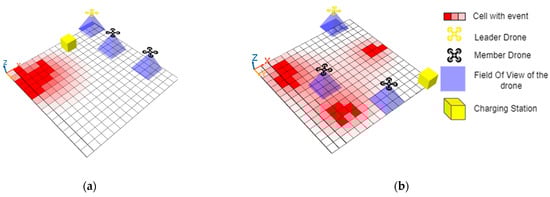 To model uncertainty, we use Equation (1) from subjective logic. We model the environment as a grid of cells. Several events could be randomly created and diffused in the environment. The events could also disappear after a certain time. In the environment, we model drones as Belief–Desire–Intension (BDI) agents. Each drone will have parametrized characteristics, such as the capacity of the battery, the range of the field of view, and the charging time. The agent drone will be able to perceive only the cell in his field of view. Once an event is perceived, the agent will calculate the opinion based on the base rate, the belief mass, the disbelief mass, and the uncertainty and send the opinion to the agent leader.