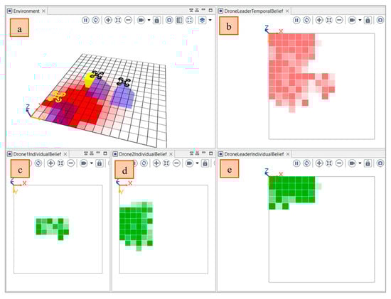Simulated Environment and state of individual belief of each drone agent and the temporal belief of team leader agent: (a) Environment; (c,d) Individual belief of drone members; (e) Individual belief of leader drone; (b) Temporal belief of drone leader.