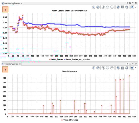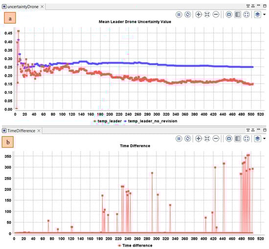 (a) Variation in the mean uncertainty over time in the temporal belief of the drone leader using only cumulative fusion operator; (b) Difference between the perceived and received opinions.