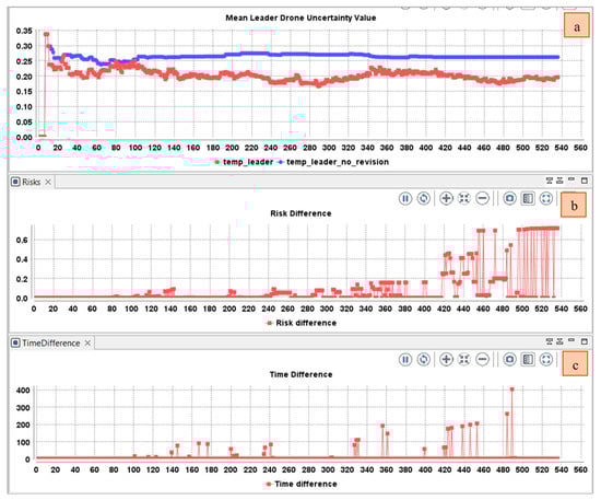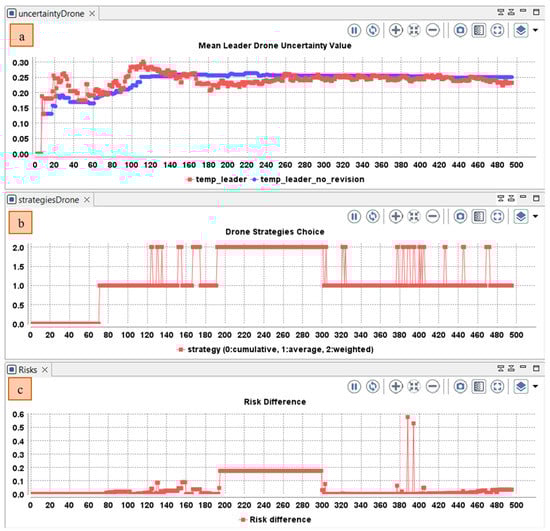 Using a cumulative fusion operator, the mean uncertainty increased due to the participation of other drone members in the collaborative awareness (Figure 8). The usage of this operator will be beneficial for events reported with small time interval. When the time interval increases, the use of the average fusion operator will be more beneficial (The uncertainty increases when the time interval increases (Figure 9). However, the average fusion operator assumes that opinions have the same importance, which is not the case if one of the reported events has an important risk value, whereas the weighted belief fusion operator considers the risk value. Thus, the uncertainty decreases when the risk increases (Figure 10). In the realized simulation, the AHP module allows the agent to alternate between operators based on the distance difference, time difference, risk difference, and trust difference. As shown in Figure 10, using the AHP module, the agent adopted the cumulative fusion operator at the beginning of the simulation. Afterward, the leader switched to the average fusion operator. Receiving event messages with a high-risk difference, the leader adopted the weighted belief fusion operator, which decreased the uncertainty in the temporal belief of the leader drone. When the risk reduced, the agent switched back to the average belief operator.